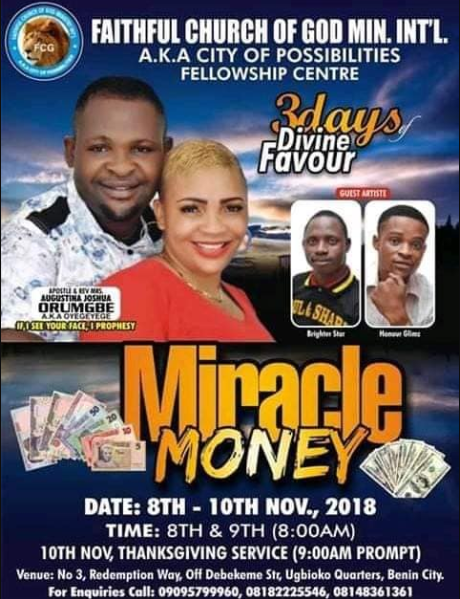 The Benin pastor died just few days before her church program, Miracle Money which was widely publicized by her husband Apostle Joshua in Edo state.