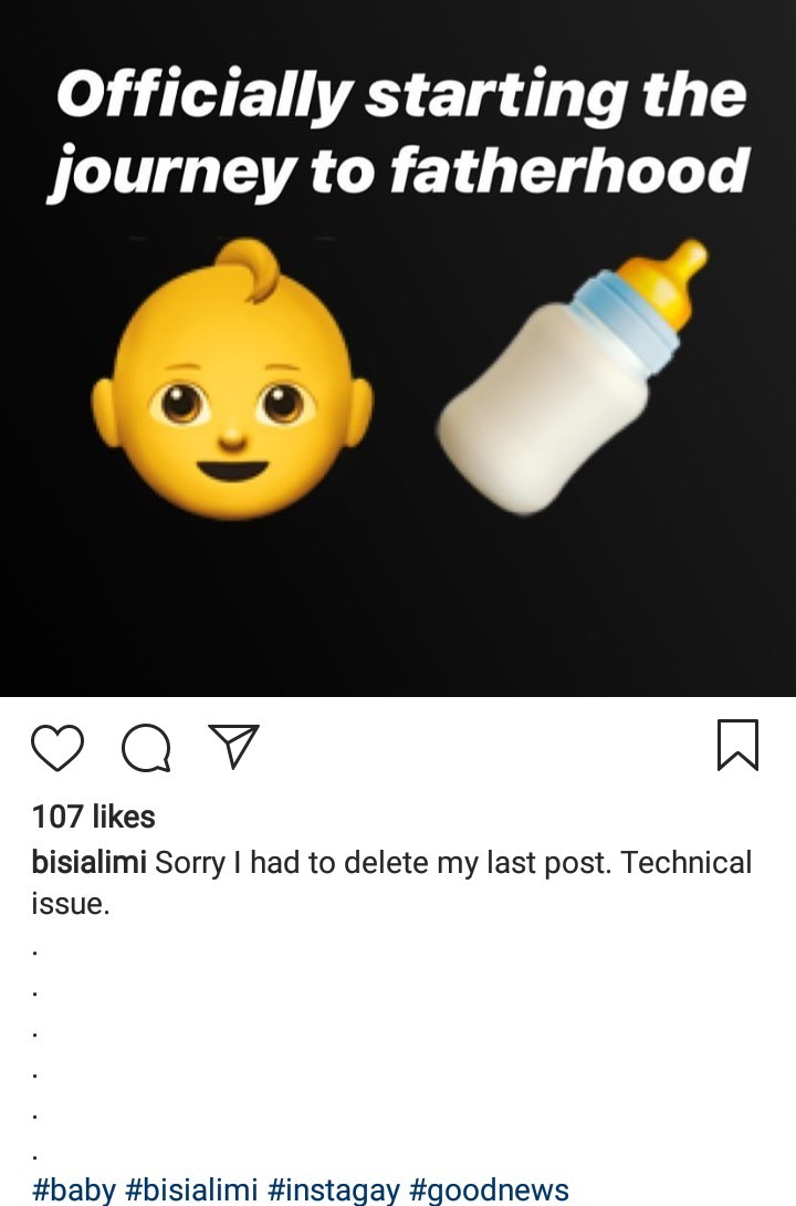 Bisi, who already has a son, added a baby and feeding bottle emoji and used the hashtag #goodnews in the caption.