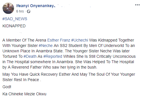 Esther Franz Uchechi, a graduate of Abia State University, Uturu (ABSU), was kidnapped along with her younger sister, Neche, an SS2 student. They were abducted in Imo state and taken to an undisclosed hideout in Anambra.