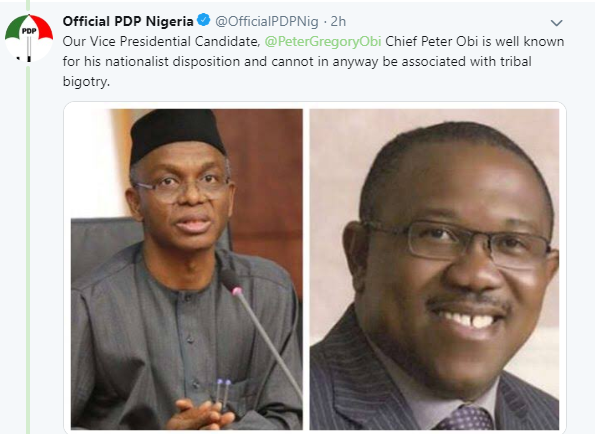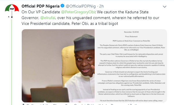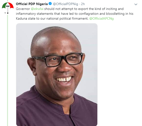 Governor Nasir El-Rufai of Kaduna State has attacked members of the Peoples Democratic Party, PDP. This followed a backlash by the party calling the governor to order over his statement describing Peter Obi as a “religious bigot.”