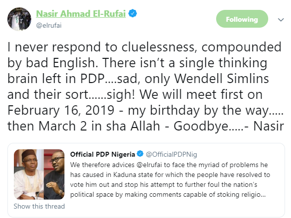 However, in a swift reaction, El-Rufai on his Twitter page lashed out at the opposition party saying ‘No single thinking brain was left in PDP’