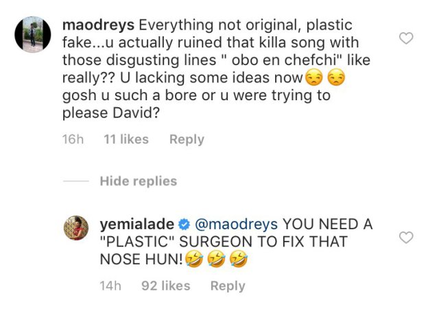 Reacting to the comment, Yemi Alade notified the troll of need for a plastic surgery to fix her nose. She wrote;
