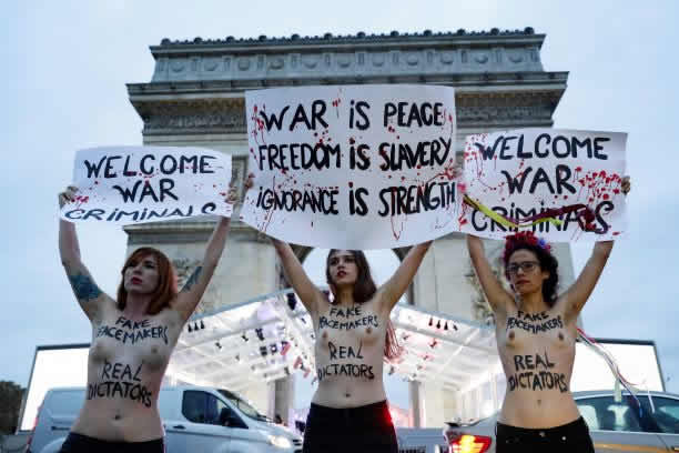 Three Femen protesters had already demonstrated at the Arc De Triomphe on Saturday morning to denounce the presence of “war criminals” among the guests at the ceremony.