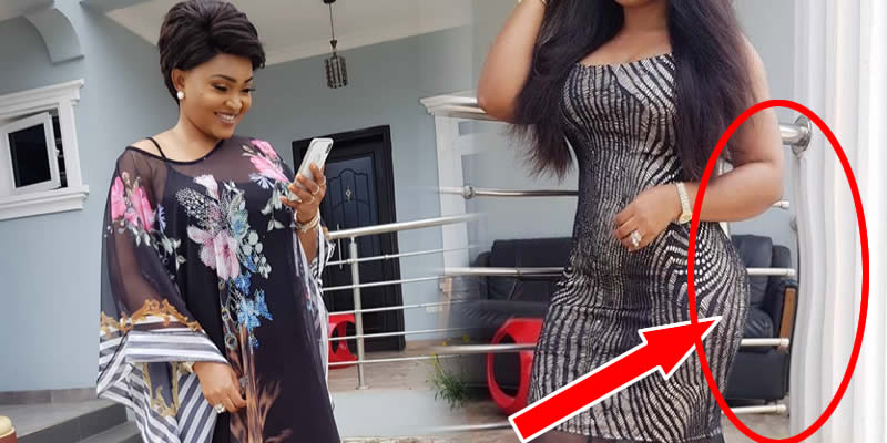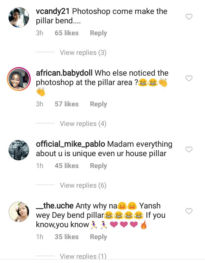 Mercy shared a beautiful photo of herself in a lovely black dress with her hips looking as curvy as always. But fans were quick to point out that she had enhanced her hip using a photo editor. The bending pillar was what gave her away.