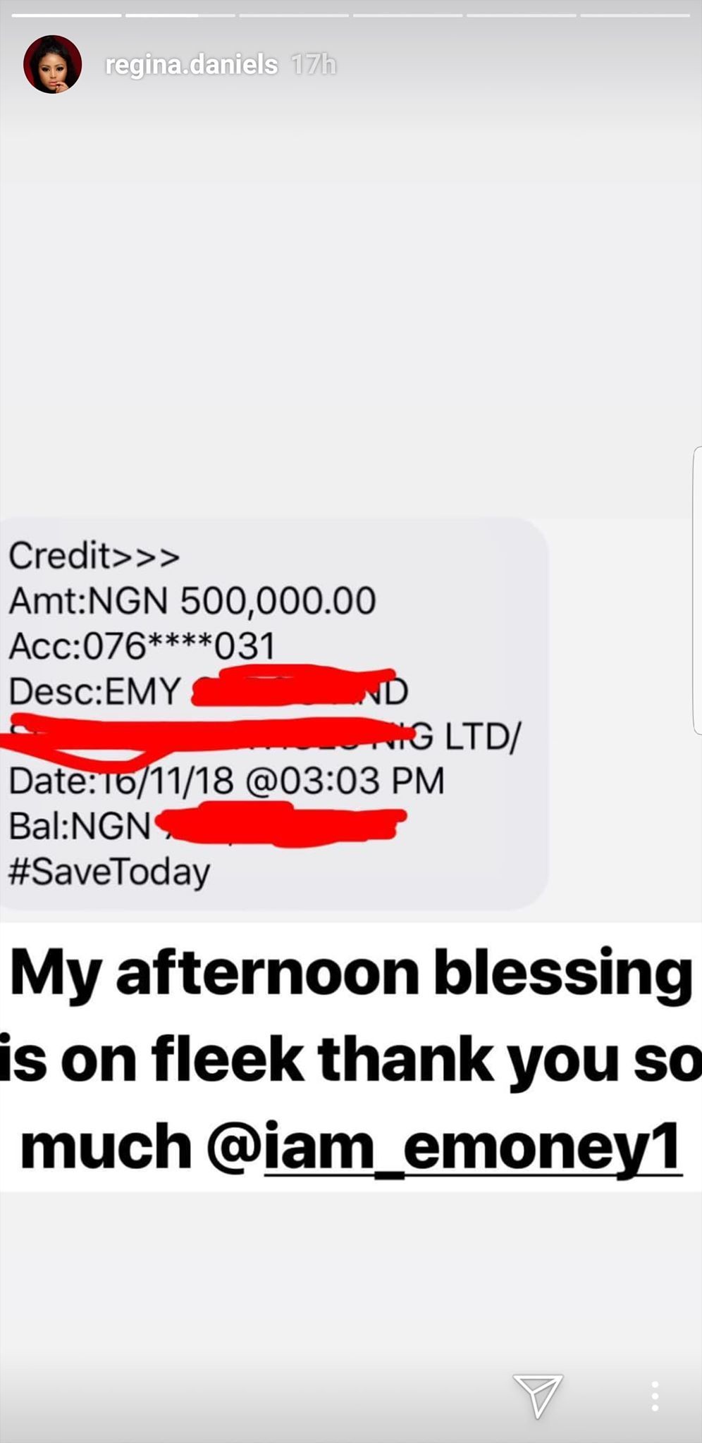 ’16 year old’ Nollywood Actress, Regina Daniels took to her Instastory to thank billionaire businessman, E-money for gifting her with the sum of N500,000 (Five hundred thousand naira).