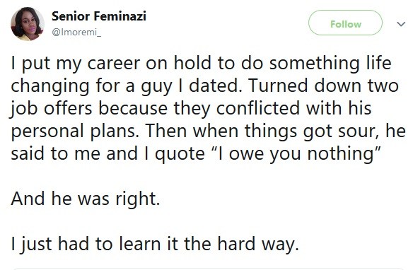 I put my career on hold to do something life changing for a guy I dated. Turned down two job offers because they conflicted with his personal plans. Then when things got sour, he said to me and I quote “I owe you nothing” And he was right. I just had to learn it the hard way.