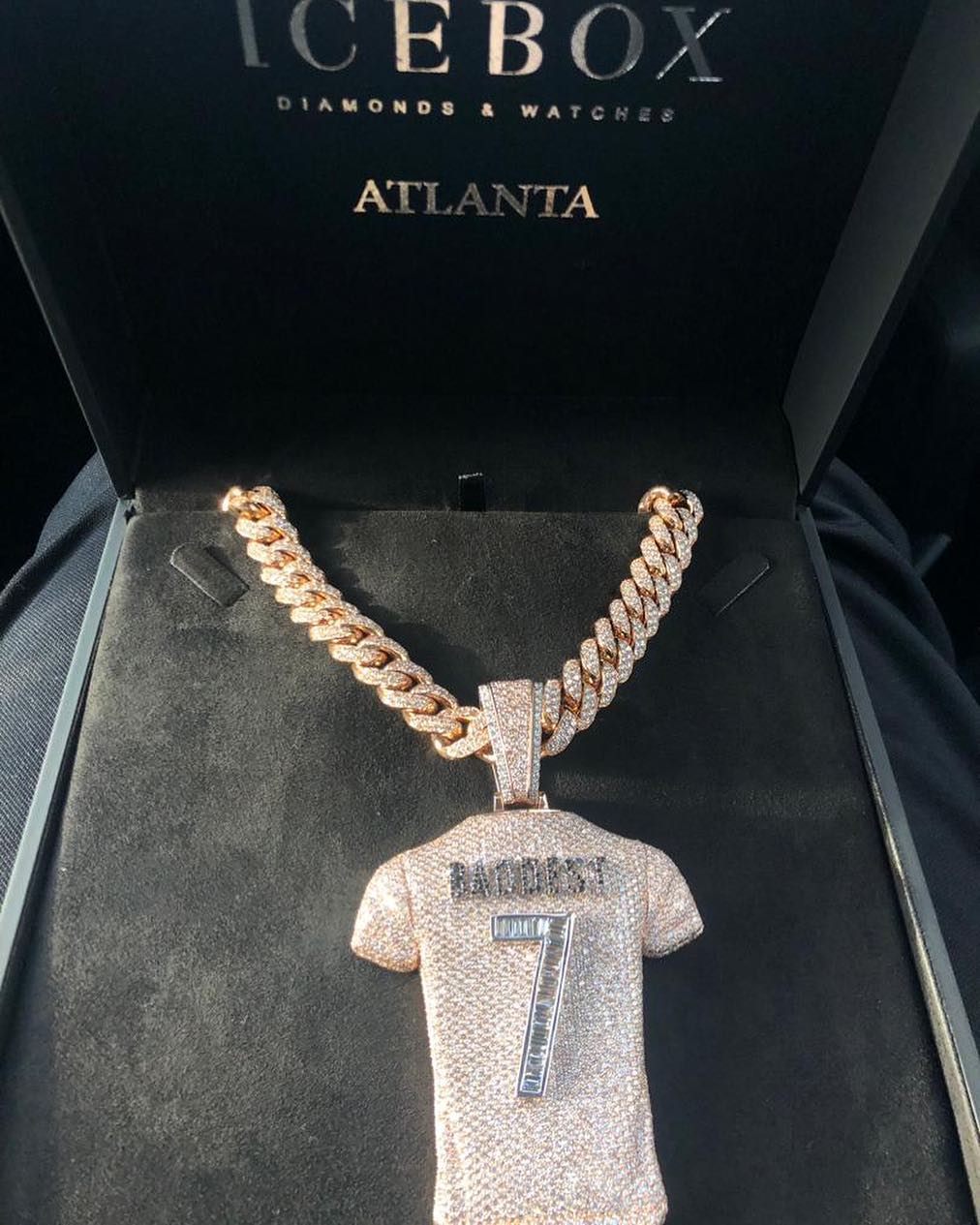 Not long after, another came, and it was a customized diamond necklace, it has a pendant shaped in form of a shirt written “Baddest” on it, he then captioned it as