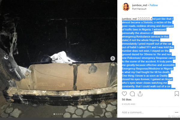 Taking to Instagram to narrate the incident, the US trained Nigerian doctor disclosed that she stayed on the ground dazed for 30 minutes to 1 hour and not one Policeman/ emergency Response came to the scene of the accident.
