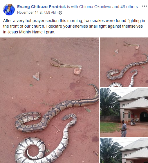 ”After a very hot prayer section this morning, two snakes were found fighting in the front of our church. I declare your enemies shall fight against themselves in Jesus Mighty Name I pray.