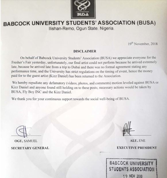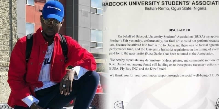 ‘We send our sincere apologies to Kizz Daniel and the students of Babcock Universi ty for any inconvenience experienced. We hereby repudiate any defamatory content against BUSA, Kizz Daniel and Fly boy INC’ the statement partly read