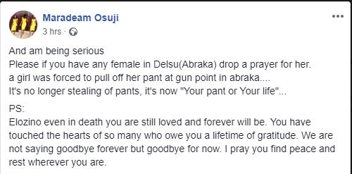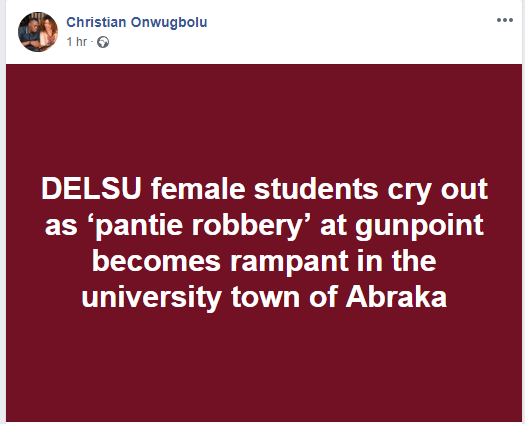 A student of the institution, Maradeam Osuji, took to Facebook earlier today to write; Please if you have any female in Delsu(Abraka) drop a prayer for her. A girl was forced to pull off her pant at gun point in Abraka. It’s no longer stealing of pants, it’s now “Your pant or Your life”…