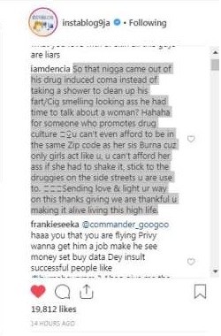 “So that nigga came out of his drug-induced coma instead of taking a shower to clean up his fart/Cig smelling looking ass he had time to talk about a woman? Hahaha for someone who promotes drug culture