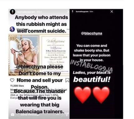 Burna Boy in a series of posts shared on his IG stories has asked Blac Chyna not to bring her ‘Poison’ to his home country Nigeria. The singer also warned that anyone who attends the event or perhaps patronizes the product might as well commit suicide.
