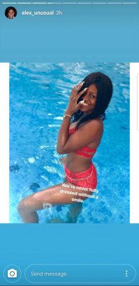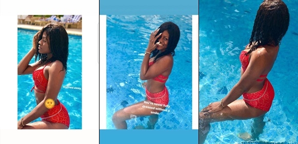 She recently took to her InstaStories to share kinky new photos of herself donning a red bikini as she hits the swimming pool.