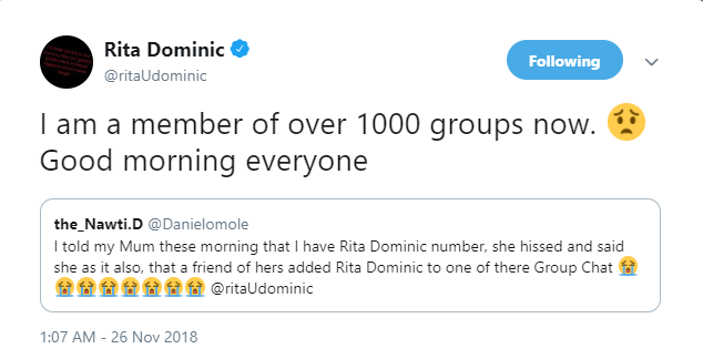 While reacting to a Twitter user who revealed that Rita’s number has been to her mum’s WhatsApp group, the actress wrote: ‘I am a member of over 1000 groups now.  Good morning everyone.’