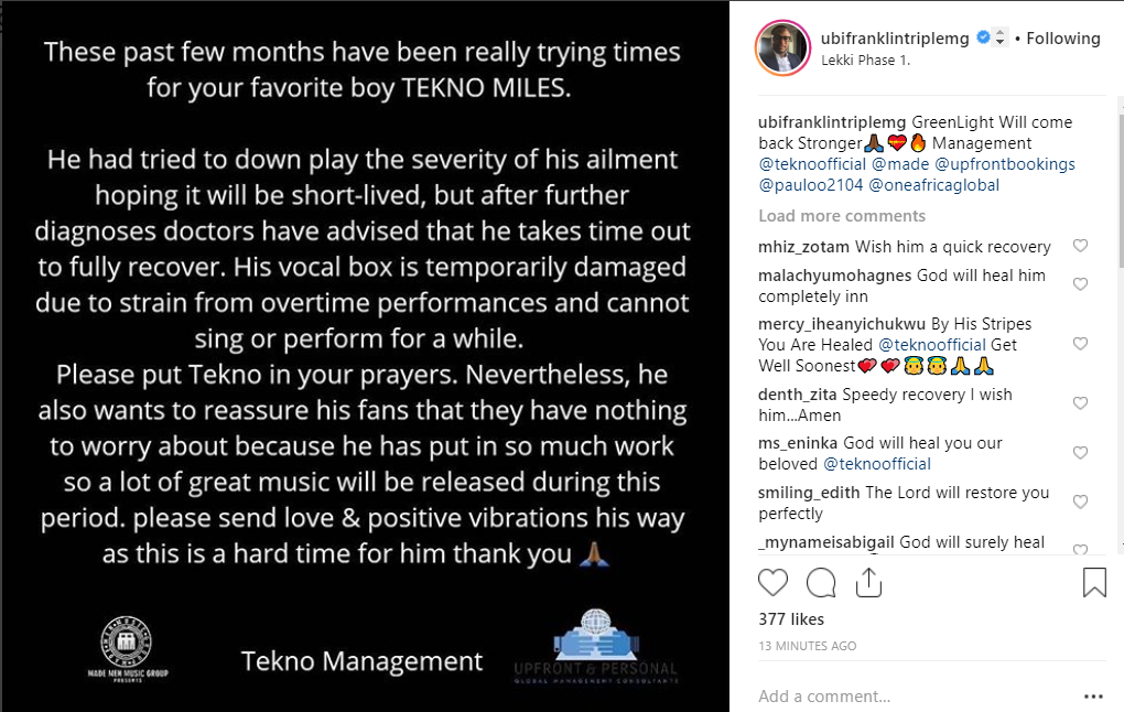 Tekno‘s management has just revealed that the artiste can no longer sing or perform for now after a temporal damage to his vocal box due to strain from overtime performances.