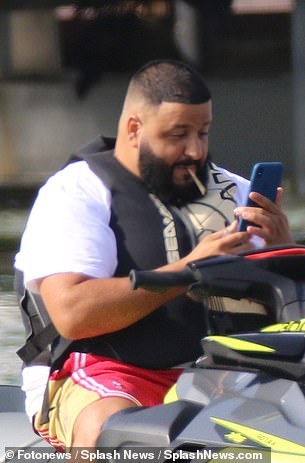 The couple were watched by their two-year-old boy Asahd Tuck Khaled, who was pictured with a carer as his parents rode jet skis around Miami.