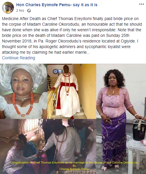 Accroding to Pemu, the chief on Sunday November 25th, led a delegation of his family members to the home of the deceased to pay her brideprice so he can bury her as his wife. Read what Pemu wrote on Facebook below