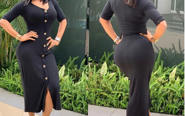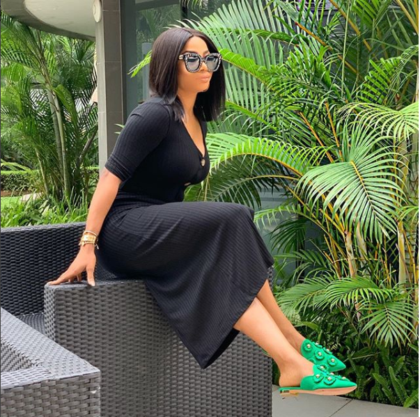 Media personality and author, Toke Makinwa, shared these new stunning photos of herself posing in a black figure-hugging dress that flaunted her curves.