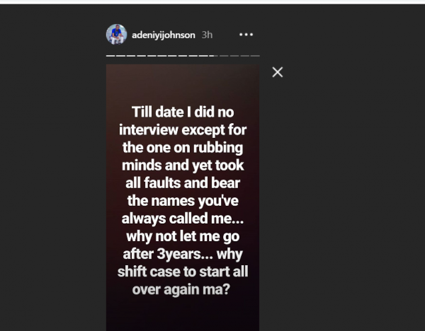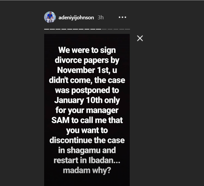 On his Instagram stories, Johnson said, “We were to sign divorce papers on November 1st, you didn’t come. The case was postponed to January 10th, only for your manager, Sam, to call me that you want to discontinue the case in Shagamu and restart in Ibadan. Madam why?”