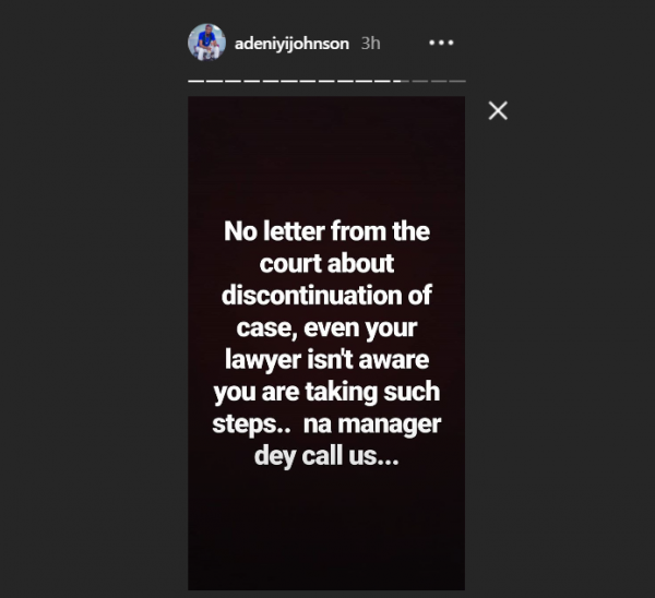 “No letter from the court about the discontinuation of the case, even your lawyer isn’t aware you are taking such a step. Na manager dey call us.