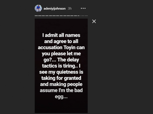 “I admit to all the names and accusations. Toyin, can you please let me go? The delay tactic is tiring. I see my quietness being taken for granted and is making people assume, I’m the bad egg.”