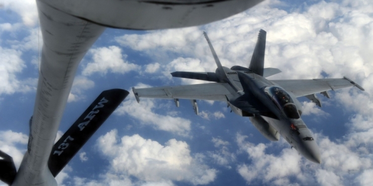 The fighter jet then inserts a probe inside the drogue to receive fuel, which it can do at a rate of up to 300 gallons per minute, according to globalsecurity.org.
