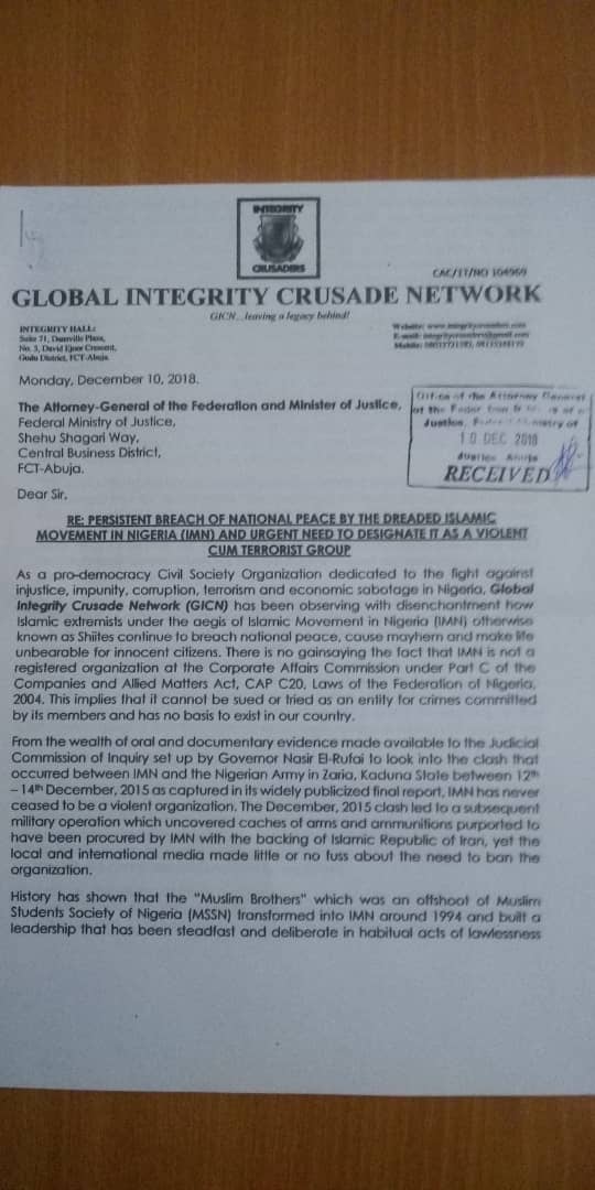 The group further said, “Being the foregoing as it may, a careful reading of the combined provisions of Terrorism (Prevention) Act, 2011 and Terrorism (Prevention) (Amendment) Act, 2013 establishes that IMN by its activities and characters ought to be proscribed and designated as a terrorist group just like Boko Haram and Indigenous People of Biafra (IPOB). For purposes of clarity, we have identified the many infractions committed by IMN since it came into existence in Nigeria to wit; Acts of Terrorism: Section 1 Subsection (1) of the Terrorism (Prevention) (Amendment) Act, 2013 prohibits all acts of terrorism and financing of terrorism while Section 1 Subsection (2) of the Act prescribes a maximum of death sentence for any person or body corporate who willingly commits an offence relating to terrorism either directly or indirectly within or outside Nigeria”.