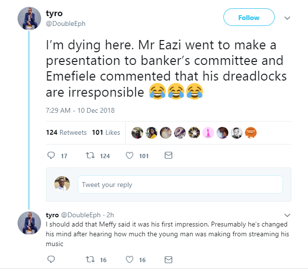 However a Twitter user who present at the event, disclosed that CBN Governor Godwin Emefiele allegedly told Mr Eazi that his dreadlocks is irresponsible, And it was gathered that the Governor of the Apex Bank said it was his first impression. @DoubleEph wrote;