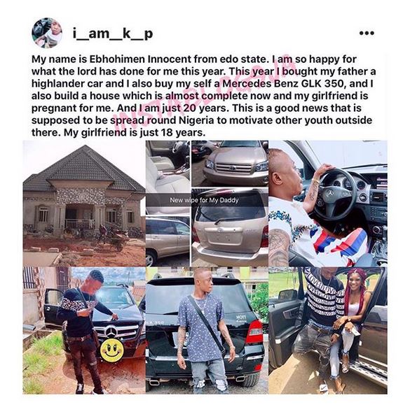 According to the young man who shared photos of his 2018 achievements, has disclosed that he is building a new house, bought cars for his father and himself and his expecting a baby on the way as his girlfriend is pregnant for him.’