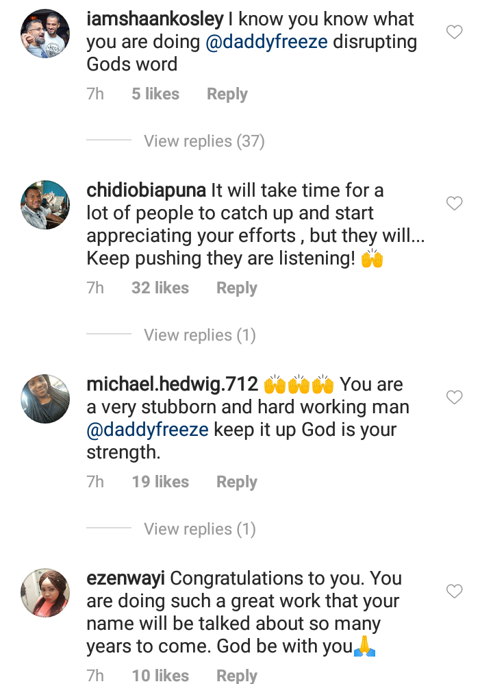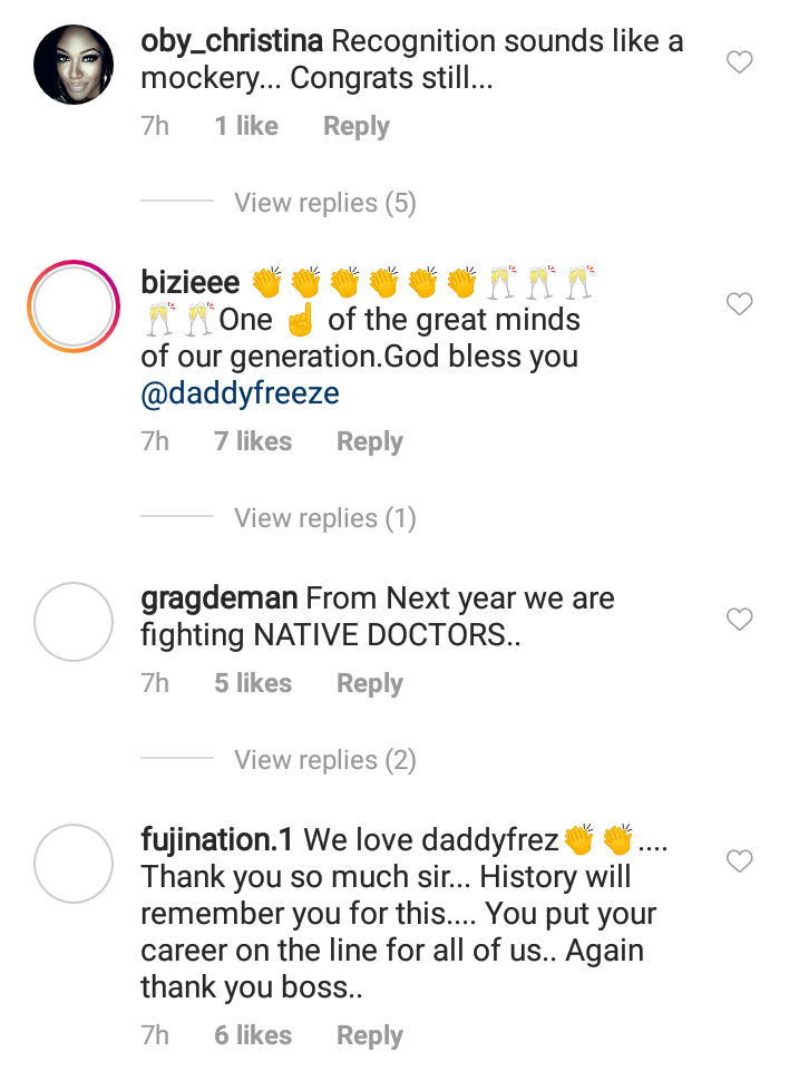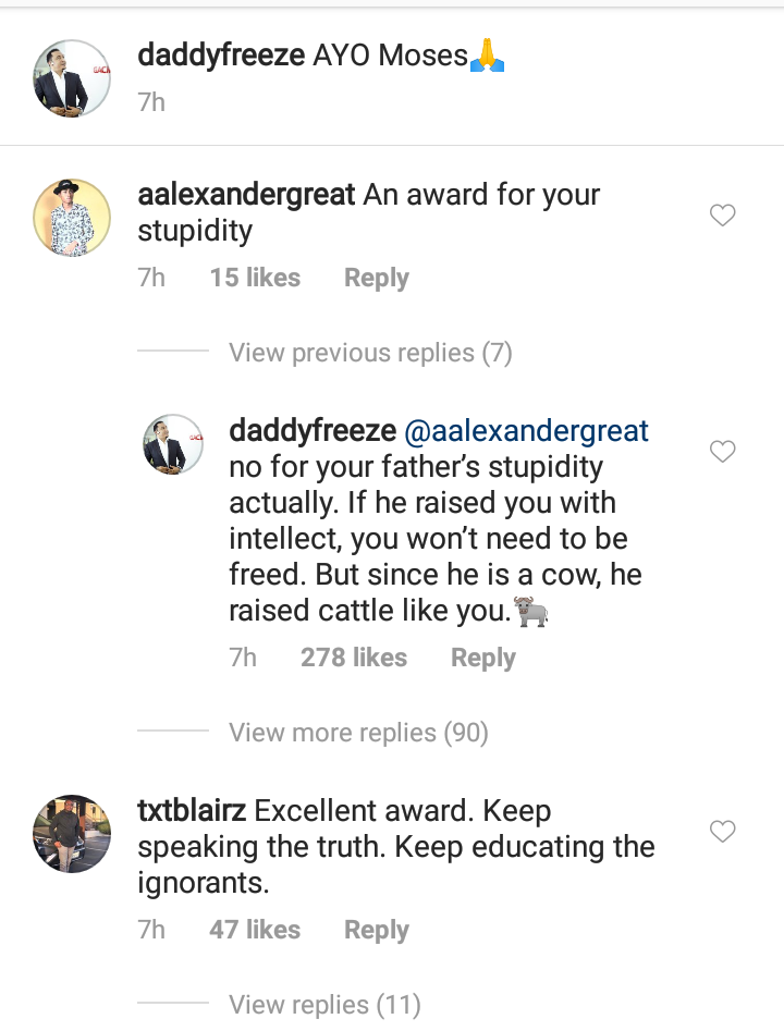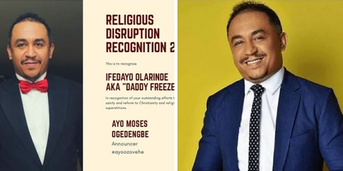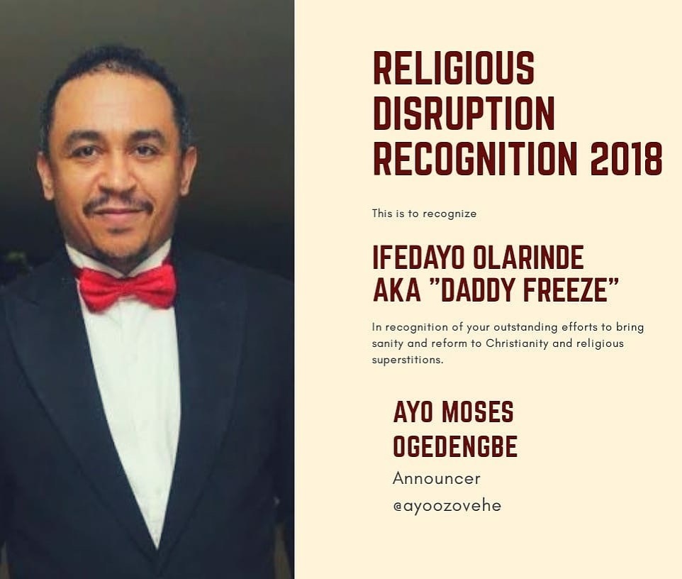Media personality and Free the sheeple originator, Ifedayo Olarinde, who goes by the moniker, Daddy freeze was recently given a Religion Disruption Award from from one of his people.