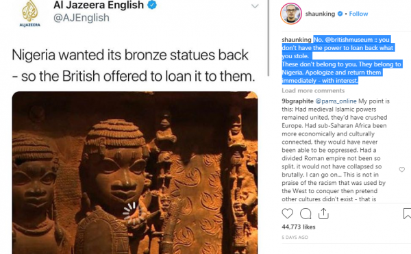 US Journalist Shaun King, has called out a British Museum over plans to loan Nigeria bronze statues they stole from old Benin empire.