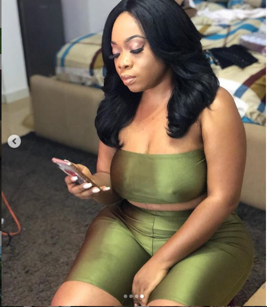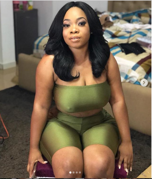 Ghanaian actress and model, Moesha Boduong, took to Instagram to flaunt her killer curves and nipples while posing in matching mini tube top and bike shorts.