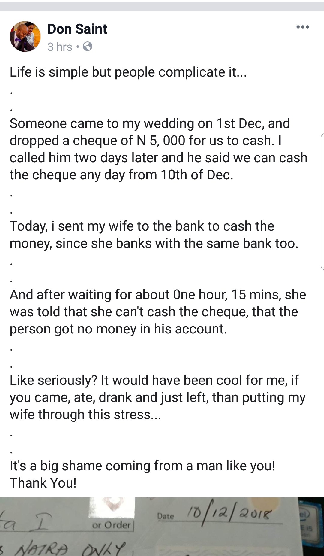 Nwafor Chigozie Paul also known as Don Saint, took to Facebook to call out the wedding guest after his wife visited the bank to cash the N5,000 cheque but was told by bank officers that there was no money in the account.