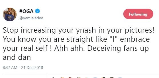 In a table shaking tweet this morning, Yemi Alade wrote, ‘stop increasing your ynash in your pictures! You know you are straight like “I” embrace your real self ! Ahh ahh. Deceiving fans up and down’.