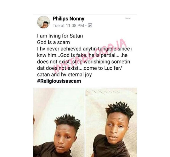 A Nigerian man simply identified as, Philips Nonny has taken to social media to announce that he has finally dumped God for Satan.