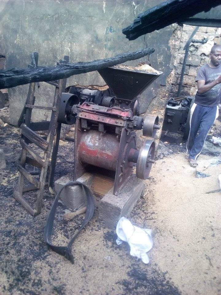 “When I visited the scene, I saw about 5-black stone Rice Milling machines, bags of parboiled rice and the whole roof and interior of the building completely raised”.