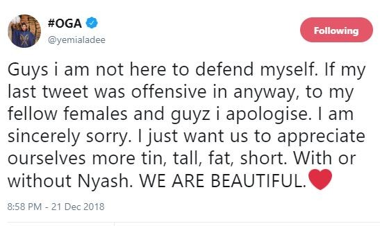 ‘guys I am not here to defend myself. If my last tweet was offensive in anyway, to my fellow females and guyz i apologise. I am sincerely sorry. I just want us to appreciate ourselves more tin, tall, fat, short. With or without Nyash’.