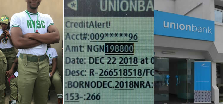 A corps member of the National Youth Service Corps (NYSC) just reported to the scheme after he was credited N198,800 instead of N19,800.
