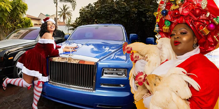 Actress Eniola Badmus shared a rather hilarious photo of herself carrying chickens as she pose for pictures.