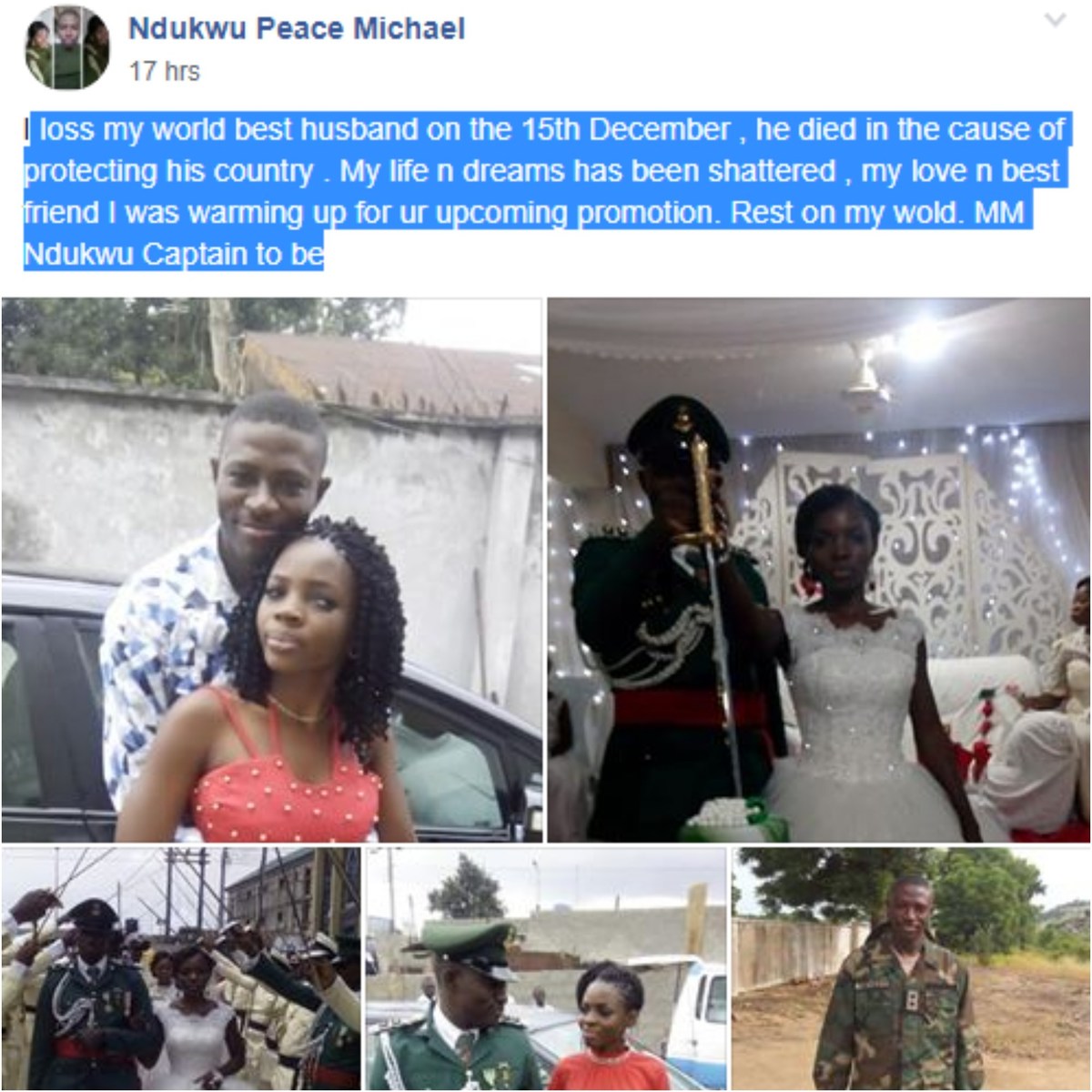Peace Michael said: “I lost my world best husband on the 15th December , he died in the cause of protecting his country . My life n dreams has been shattered , my love n best friend I was warming up for ur upcoming promotion. Rest on my wold. MM Ndukwu Captain to be.”
