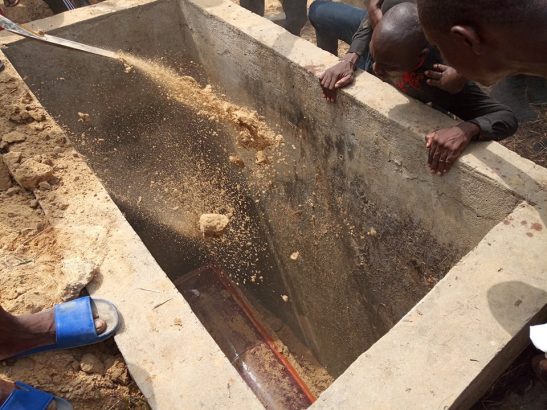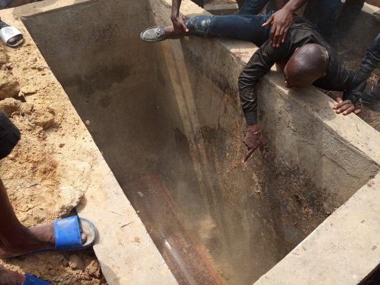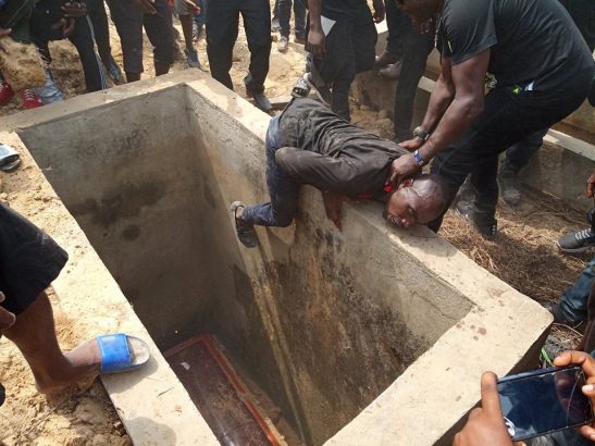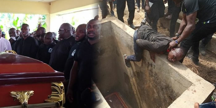The deceased was recently killed by yet to be identified gunmen. It took the intervention of other mourners to prevent his friend from entering the grave with him.