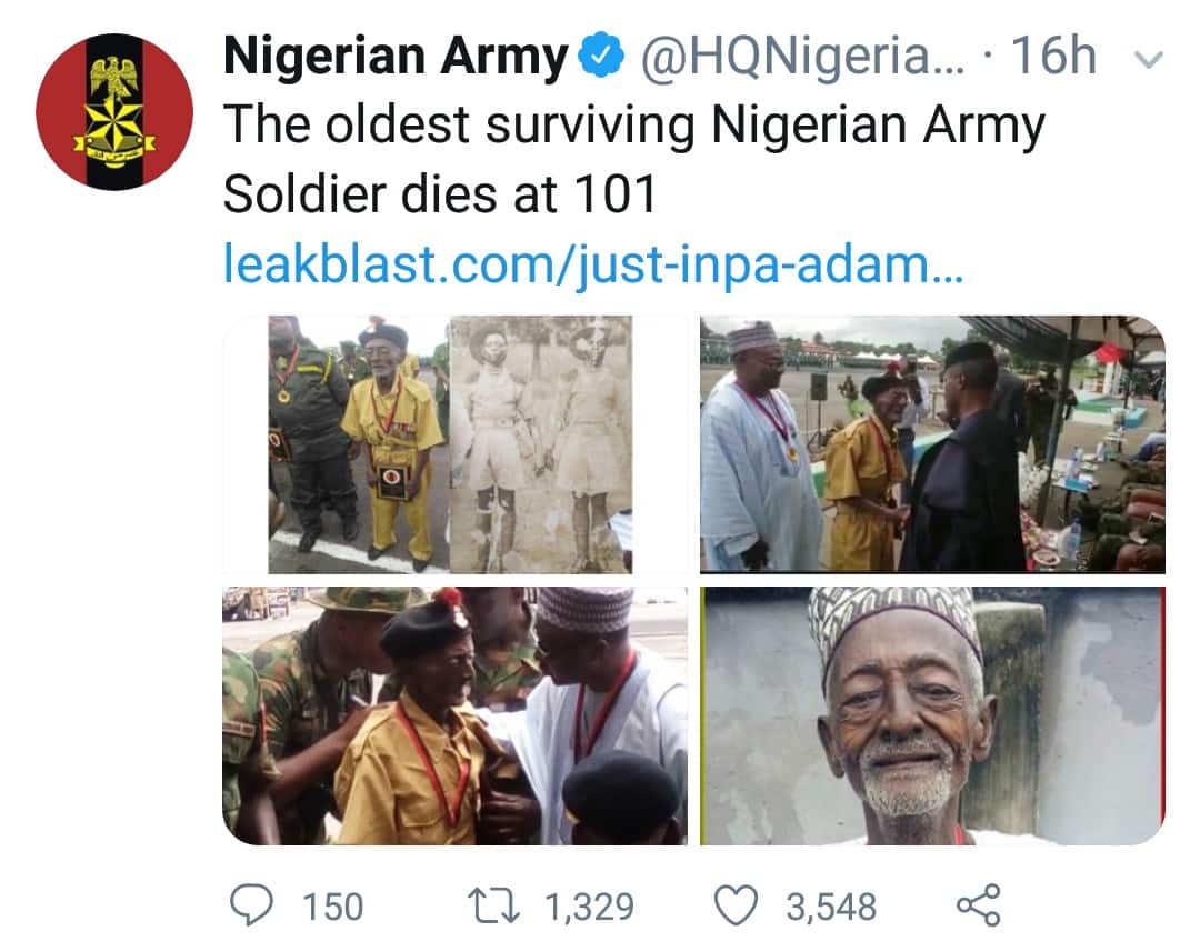The deceased soldier was reportedly born in 1918 to a farmer at Abejukolo-Ife, Kogi state and joined the army in 1945. He was said to have fought for the British colonial army in Burma and Egypt during the second world war II.