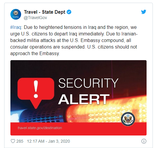 ‘Due to heightened tensions in Iraq and the region, the US Embassy urges American citizens to heed the January 2020 Travel Advisory and depart Iraq immediately.