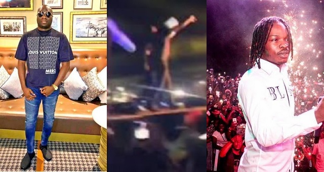 A new video has surfaced online capturing the moment controversial singer Naira Marley brought up popular Instagram big boy, Mompha to perform with him on stage during a recent concert.
