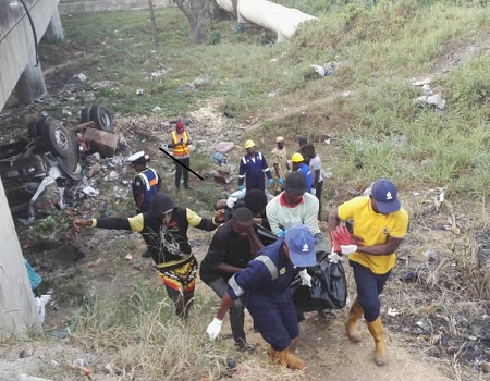 Tragedy struck in Lagos in the early hours of Saturday when two yet to be identified bodies were recovered in an auto crash involving a truck and a Sport Utility Vehicle, SUV, on the notorious Otedola Bridge, along Lagos-Ibadan Expressway.