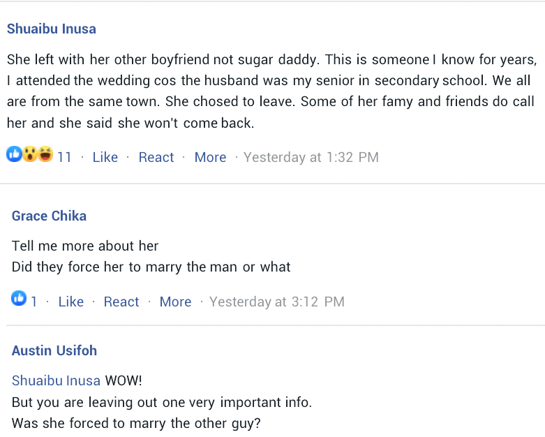 “She left with her other boyfriend not sugar daddy. This is someone I know for years, I attended the wedding cos the husband was my senior in secondary school. We all are from the same town. She chose to leave. Some of her family and friends do call her and she said she won’t come back” Inusa said.