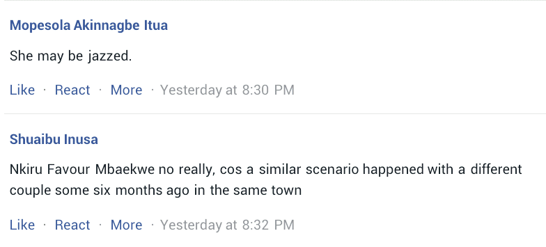 “Nkiru Favour Mbaekwe no really, cos a similar scenario happened with a different couple some six months ago in the same town” he said.