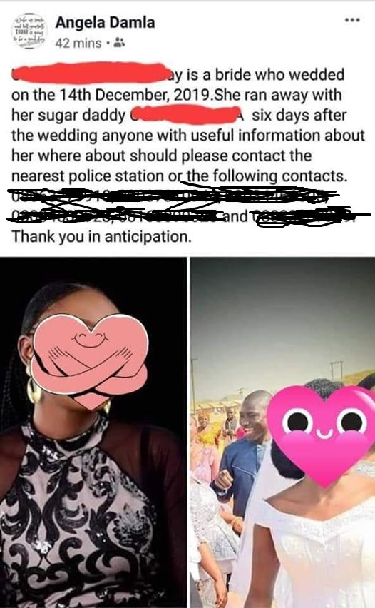 According to a post by Facebook user, Angela Damla, seeking useful information on bride’s whereabouts, the couple got married on December 14.