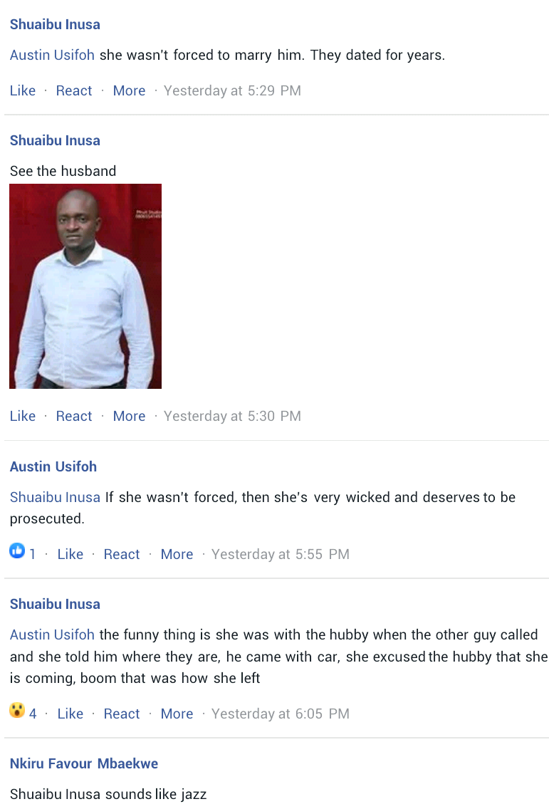“She wasn’t forced to marry him. They dated for years. The funny thing is she was with the hubby when the other guy called and she told him where they are, he came with car, she excused the hubby that she is coming, boom that was how she left” he added.